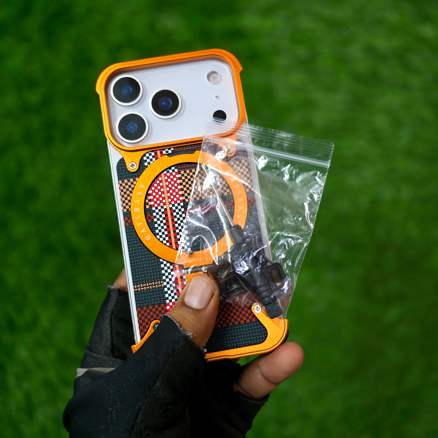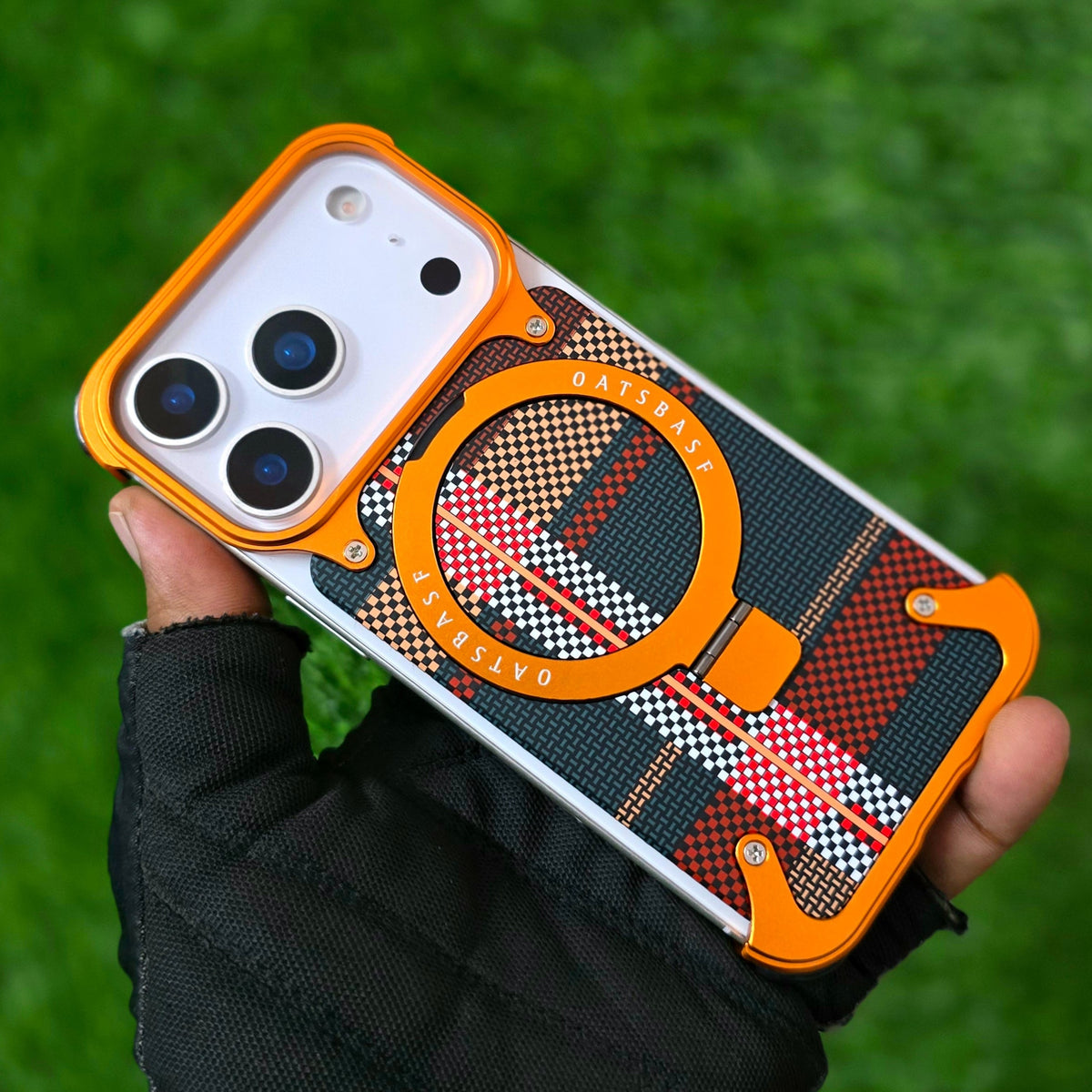 iPhone 17 Pro Metal Case, Frameless Leather Magnetic Invisible Stand Cover with Magsafe - Orange