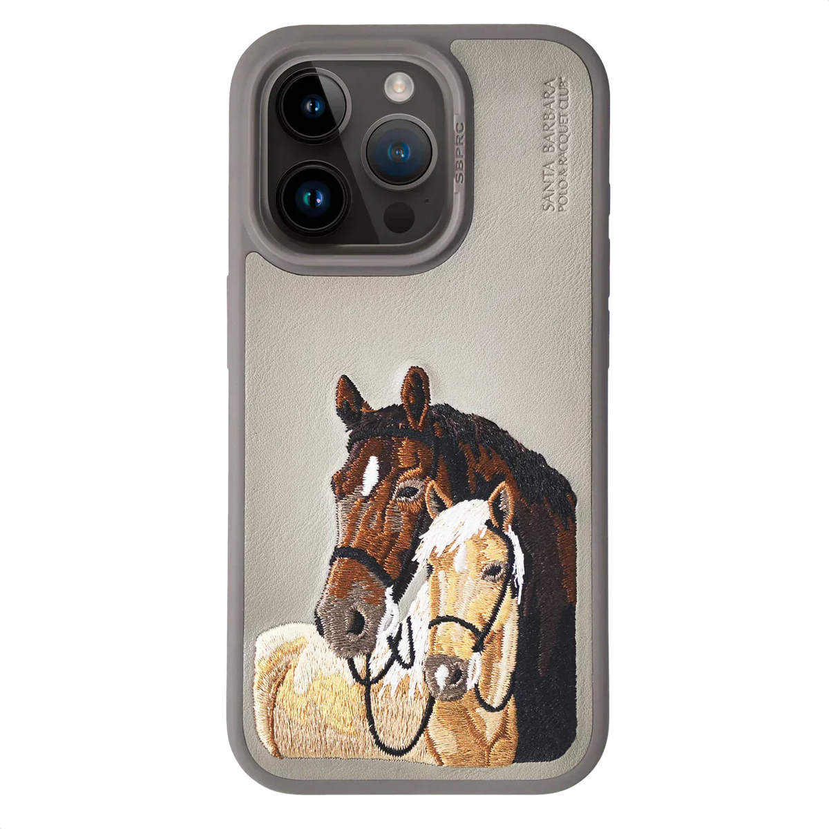 The ISIDORE Series Genuine Santa Barbara Polo Mobile Back Cover for iPhone 15 |Men and Women||Horse Series||Embroidery Cover||Luxury Back Case||Free Leather Cover of Same Model Inside| (Titanium Grey)