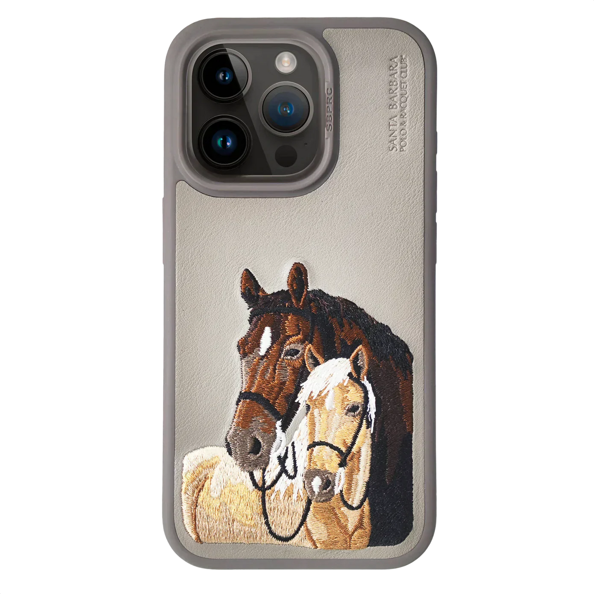 The ISIDORE Series Genuine Santa Barbara Polo Mobile Back Cover for iPhone 15 Pro |Men and Women||Horse Series||Embroidery Cover||Luxury Back Case||Free Leather Cover of Same Model Inside| (Titanium Grey)
