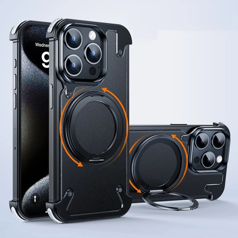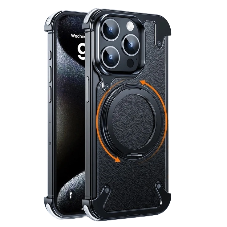 iPhone 15 Pro Max Metal Rimless Leather Rotating Ring Impact Resistance Casing with MagSafe - Black