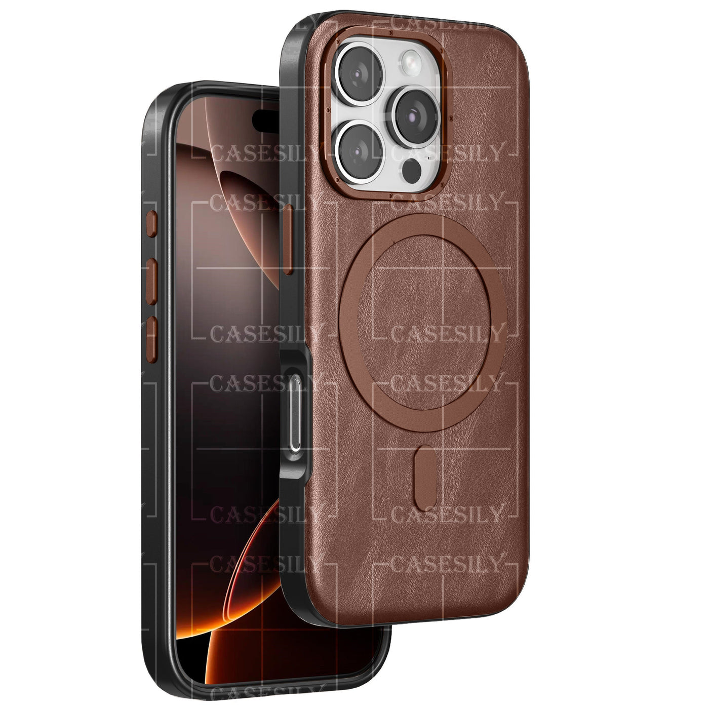 iPhone 16 Pro Max Classic Business Series Leather Case with Metal Magsafe Ring - Brown